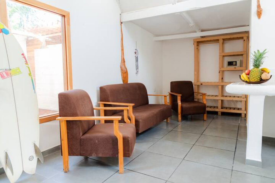 Inspired by the jungle, Surf Mariposa Lodge includes an outdoor shower for when you arrive from surfing and a common outdoor space with sofas for chilling and sharing.